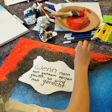 Ein weiterer Baustein war eine kreative Einheit: Die Jugendlichen gestalteten Leinwände mit ihren Konfirmationssprüchen. So entstand etwas Bleibendes, das sie später in der Konfirmandenzeit und darüber hinaus begleiten kann.