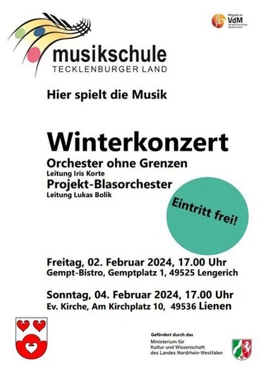 Am Sonntag, den 4. Februar 2024, findet um 17:00 Uhr in der Evangelischen Kirche in Lienen das Winterkonzert der Musikschule Tecklenburger Land statt. Nähere Informationen dazu finden Sie auf dem nachstehenden Plakat.
