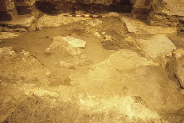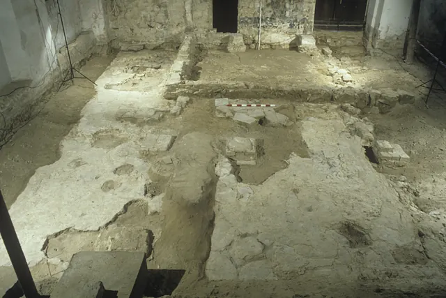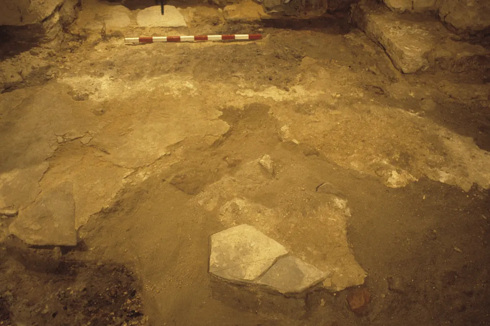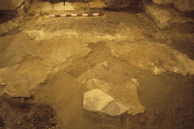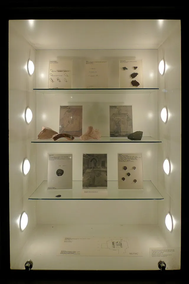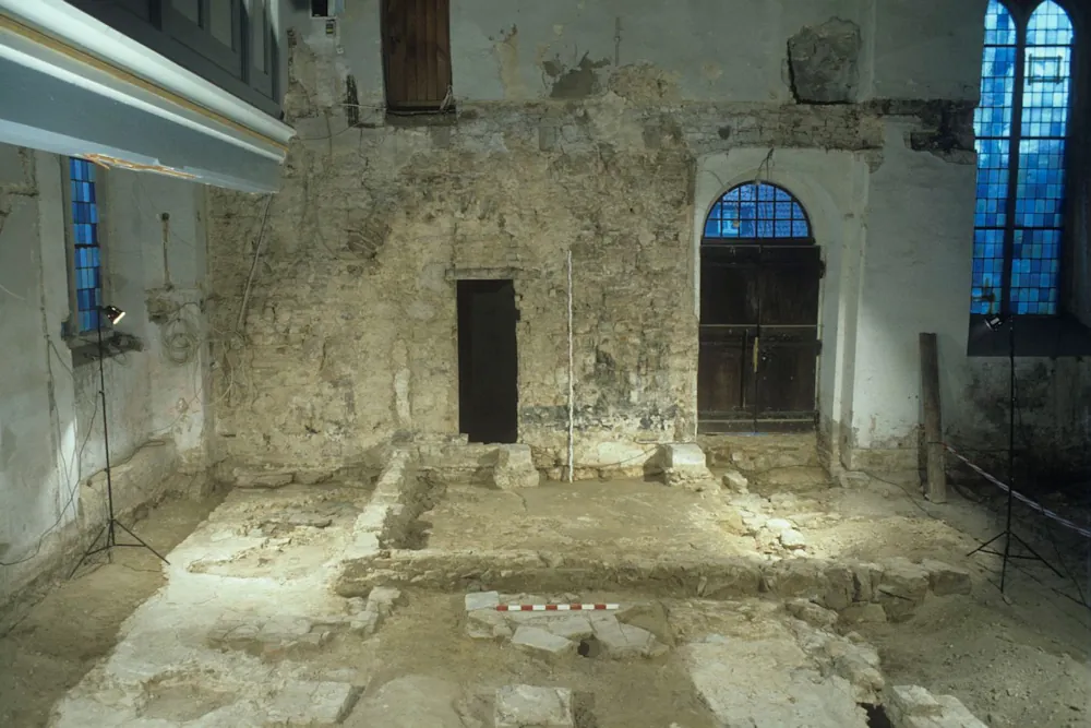 Nach der Entfernung des modernen Fußbodens und der dazu gehörenden Unterfütterung zeigten sich bereits in einer Tiefe von 0,50 m die ersten archäologischen Befunde. Sie bestanden aus vier älteren, übereinander liegenden Fußböden, wovon der oberste Plattenfußboden durch Münzfunde in das 16.–18. Jahrhundert datiert werden konnte. Die drei darunter liegenden Fußböden, zuunterst wiederum ein Plattenboden aus grau-schwarzen Steinen in Mörtel verlegt, darüber zwei dünne Kalkmörtelestriche, konnten dem romanischen Kirchenschiff zugeordnet werden. Alle vier Fußböden wiesen durch langes Begehen starke Abnutzungsspuren auf. Die Nord- und die Südwand der Kirche des 12. Jahrhunderts konnten nur noch in Resten dokumentiert werden. So zeigte sich die südliche Langhauswand lediglich als Ausbruchgrube mit sehr geringen Fundamentresten im Boden und den heranziehenden Fußböden, die hier eine gerade Abschlusskante bildeten. Die nördliche Langhauswand hingegen konnte durch das noch erhaltene Fundament mit einer Breite von 0,90 m nachgewiesen werden. So ließ sich die lichte Weite des romanischen Kirchenschiffes mit einer Breite von 5,80 m genau ermitteln. Dieser Befund war über eine Länge von 9,00 m zu beobachten. Über die Gesamtlänge des Kirchenschiffs und die Gestalt des Chores kann noch keine Aussage getroffen werden, da die ausgehobene Baugrube auch nur 9 m lang war. Der Zugang zu der romanischen Kirche erfolgte von Norden aus, wie es eine 1,40 m breite Unterfütterung aus Kalkbruchsteinen an der Nordwand belegt.